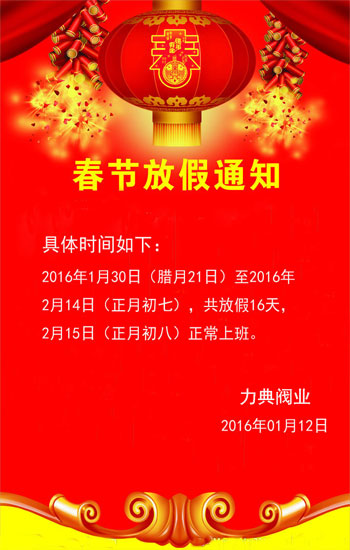 2016年力典閥業(yè)春節(jié)放假安排如下: